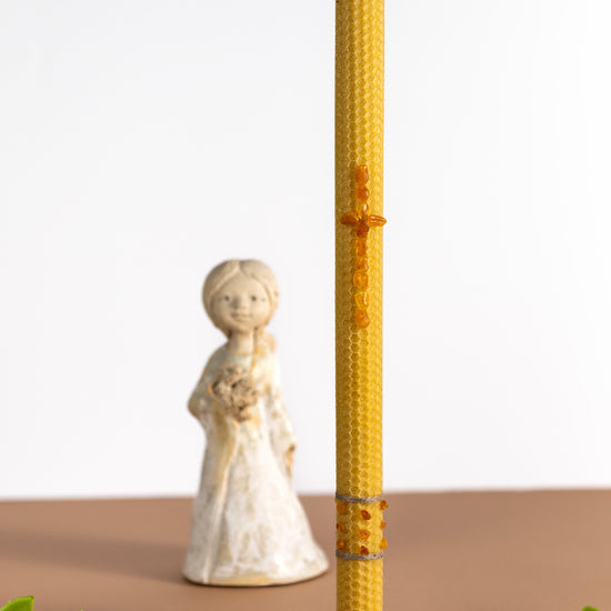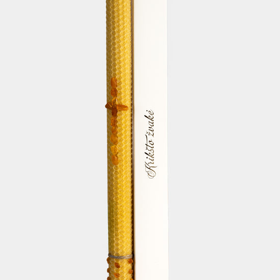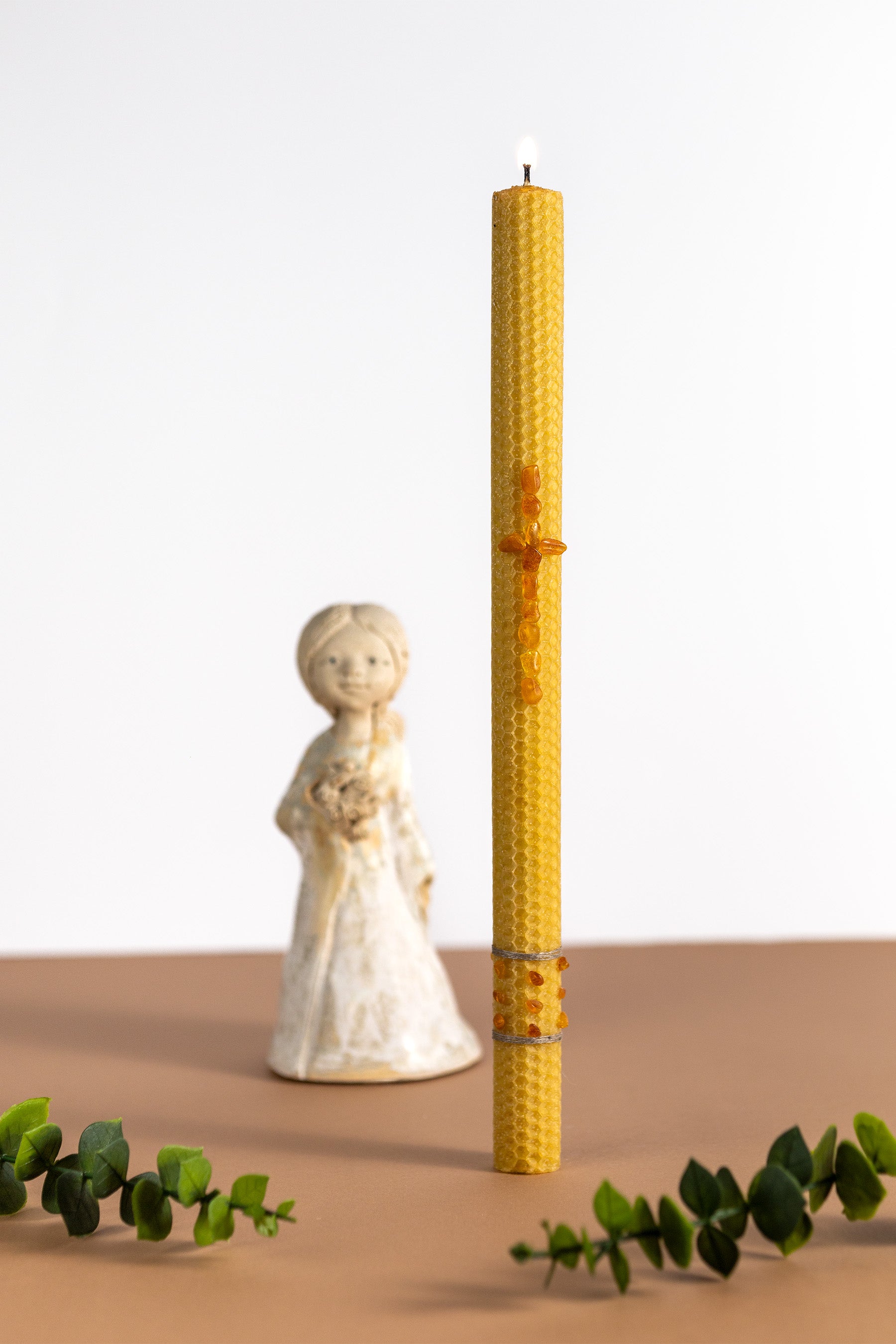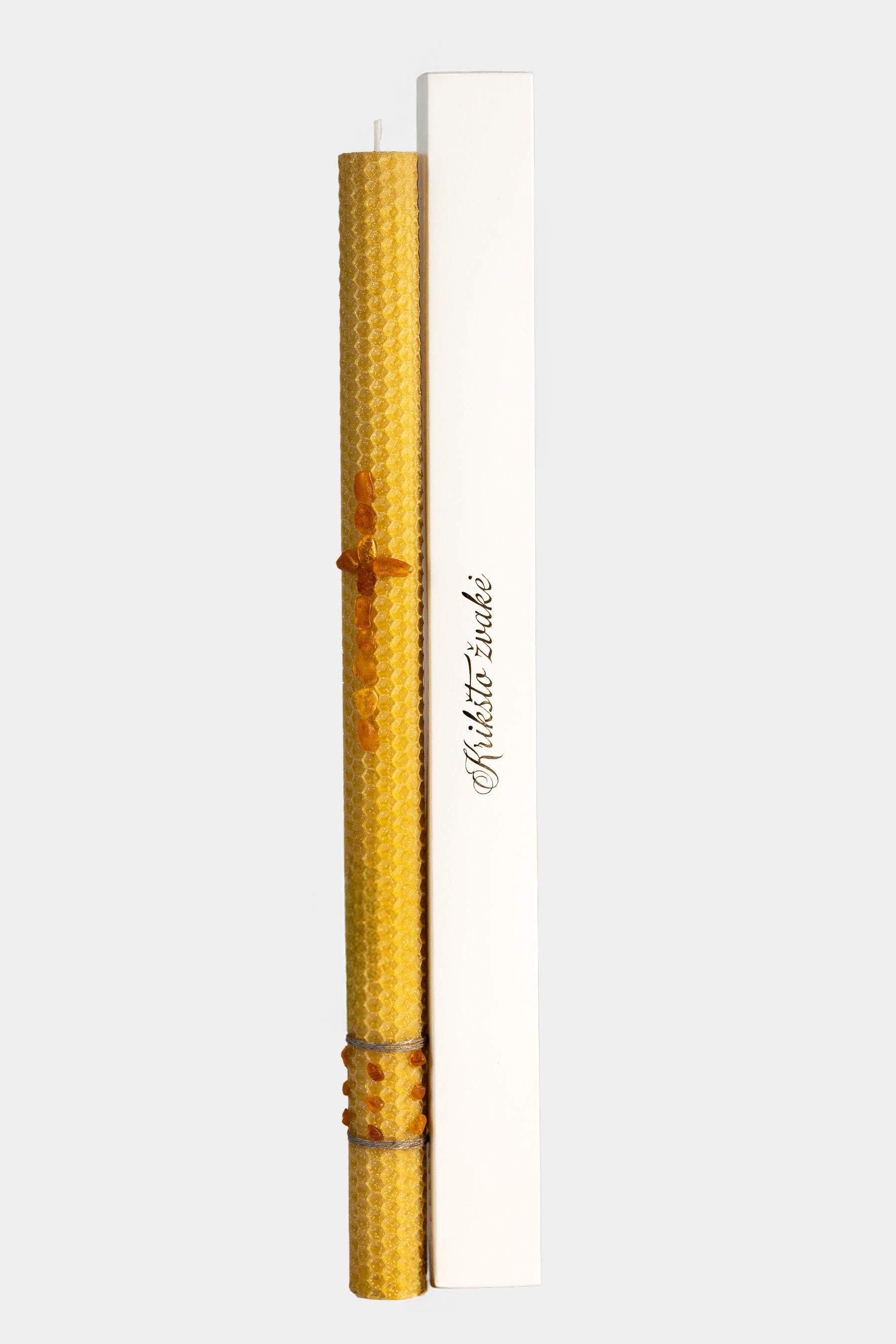 Krikšto ir Komunijos žvakė, pagaminta iš natūralaus bičių vaško, dekoruota tikru gintaru bei linu. Su dėžute.