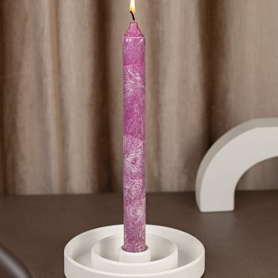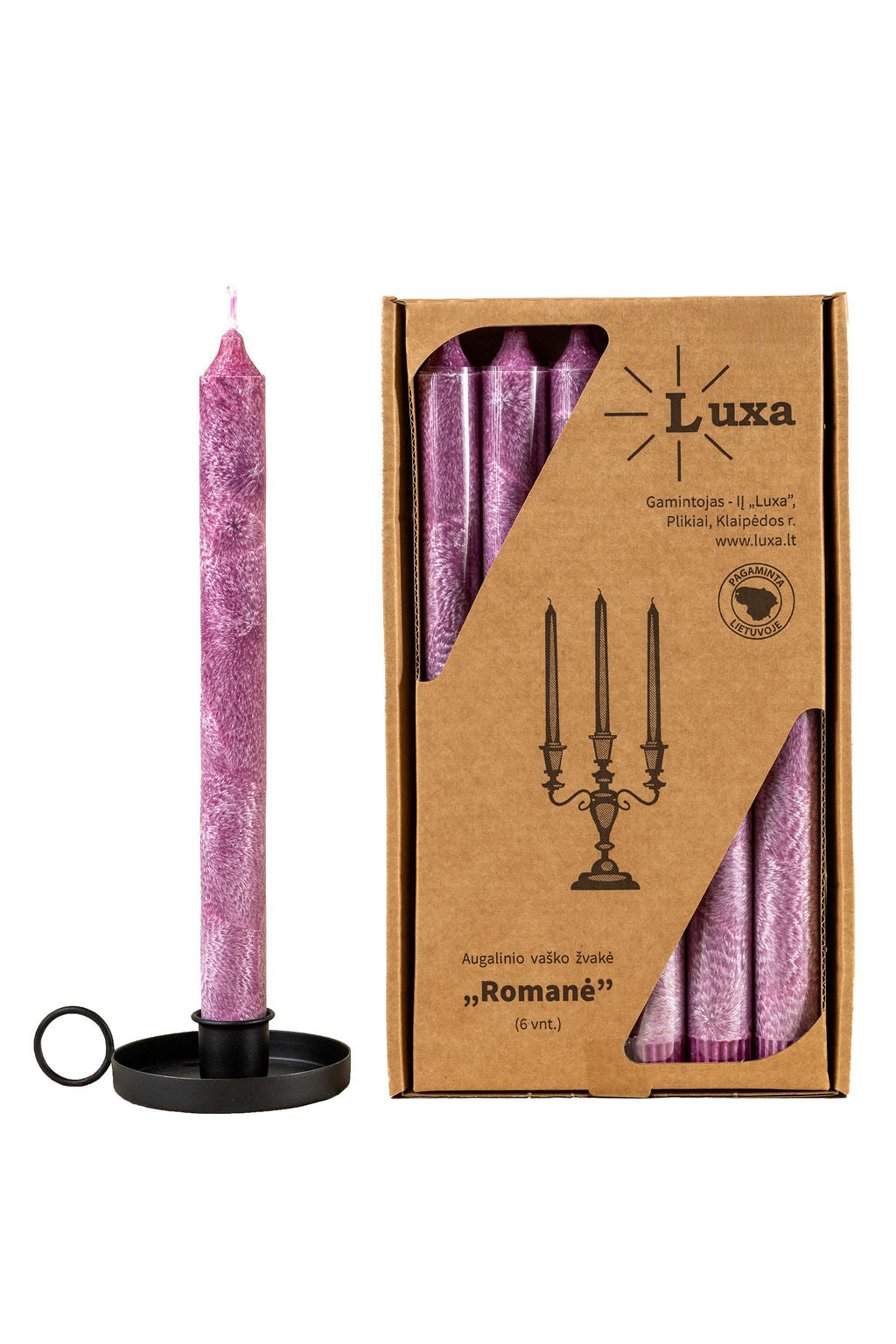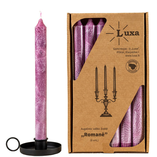 Kvepiančios stalo žvakės „Romanė” violetinės spalvos - citrusų, vaisių, gėlių, balto muskuso ir medžio aromato (6 vnt.)