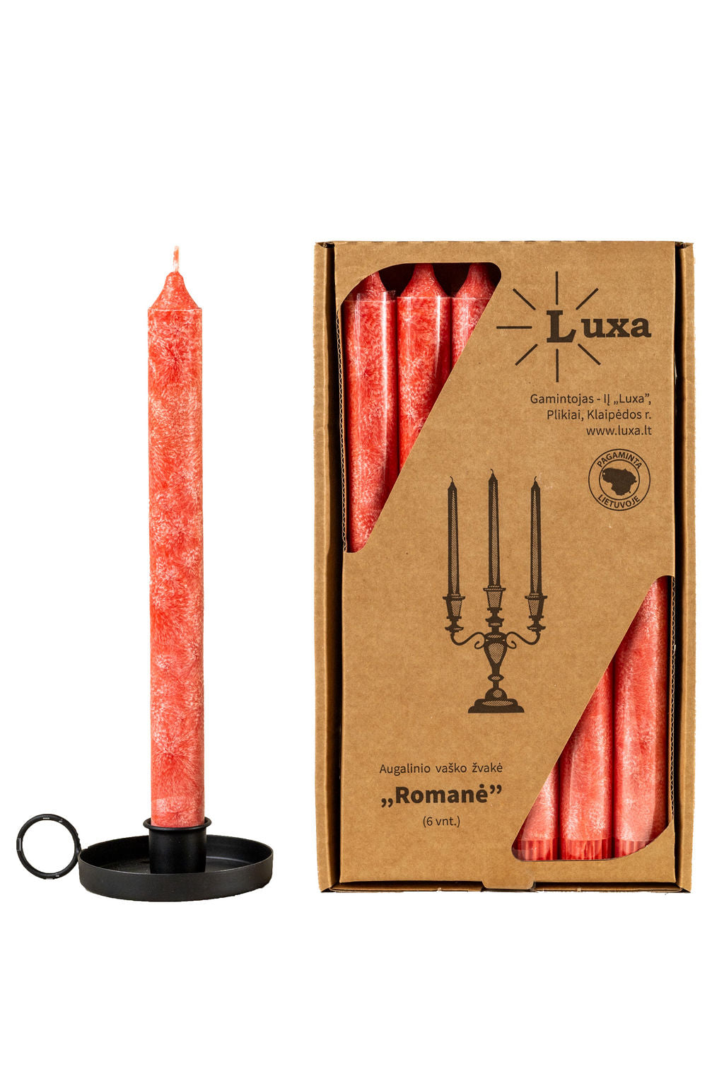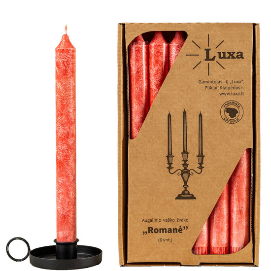 Kvepiančios stalo žvakės „Romanė” raudonos spalvos - vaisių ir uogų, cinamono bei vanilės aromato (6 vnt.)
