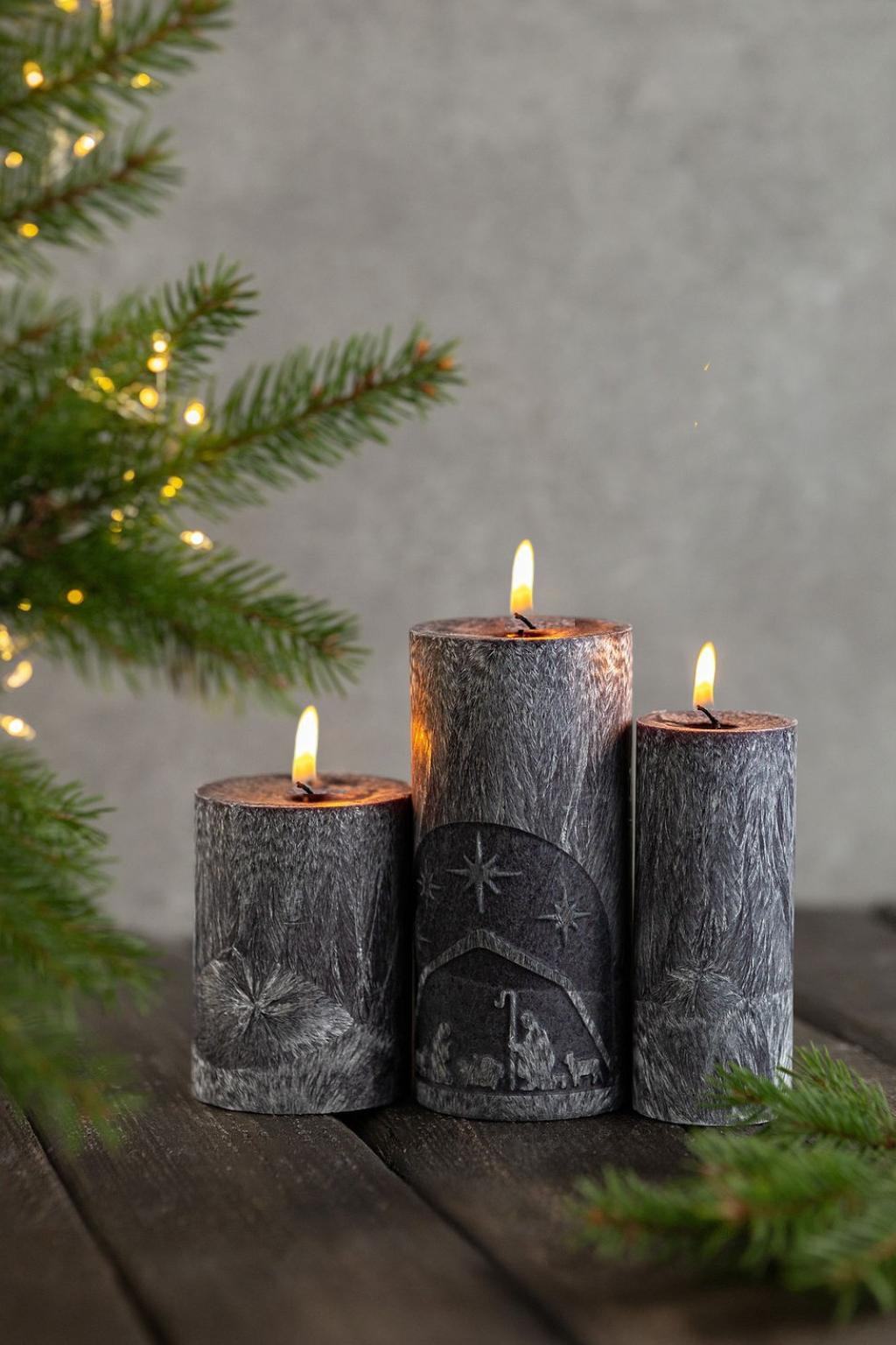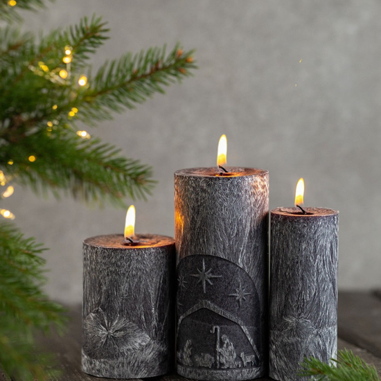- Cilindro formos kvepianti su ornamentu (išmatavimai:70 / 150 mm; degimo laikas: 48 val.; sudėtis: 100 % augalinis vaškas).