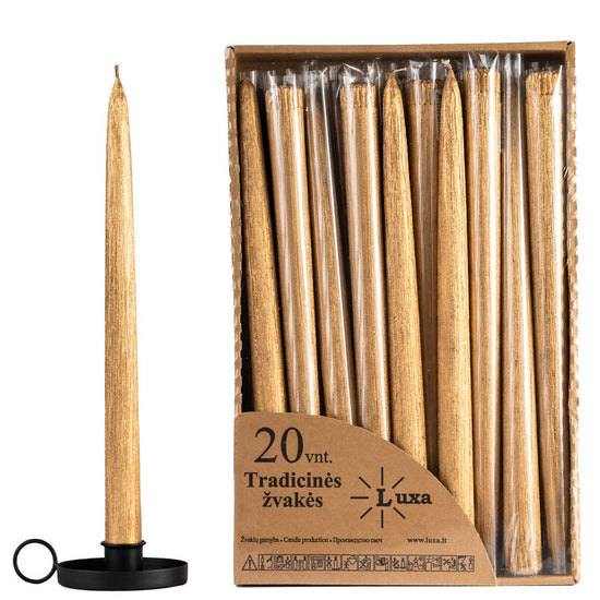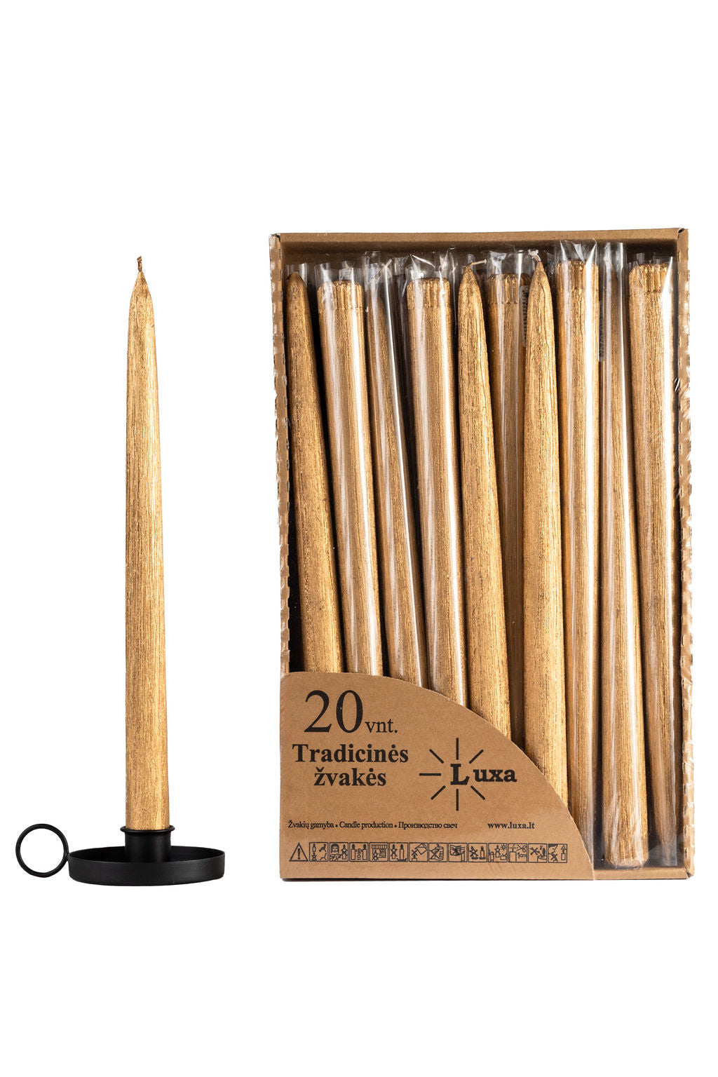 Tradicinės blizgios aukso spalvos stalo žvakės (20 vnt. / 30 cm)