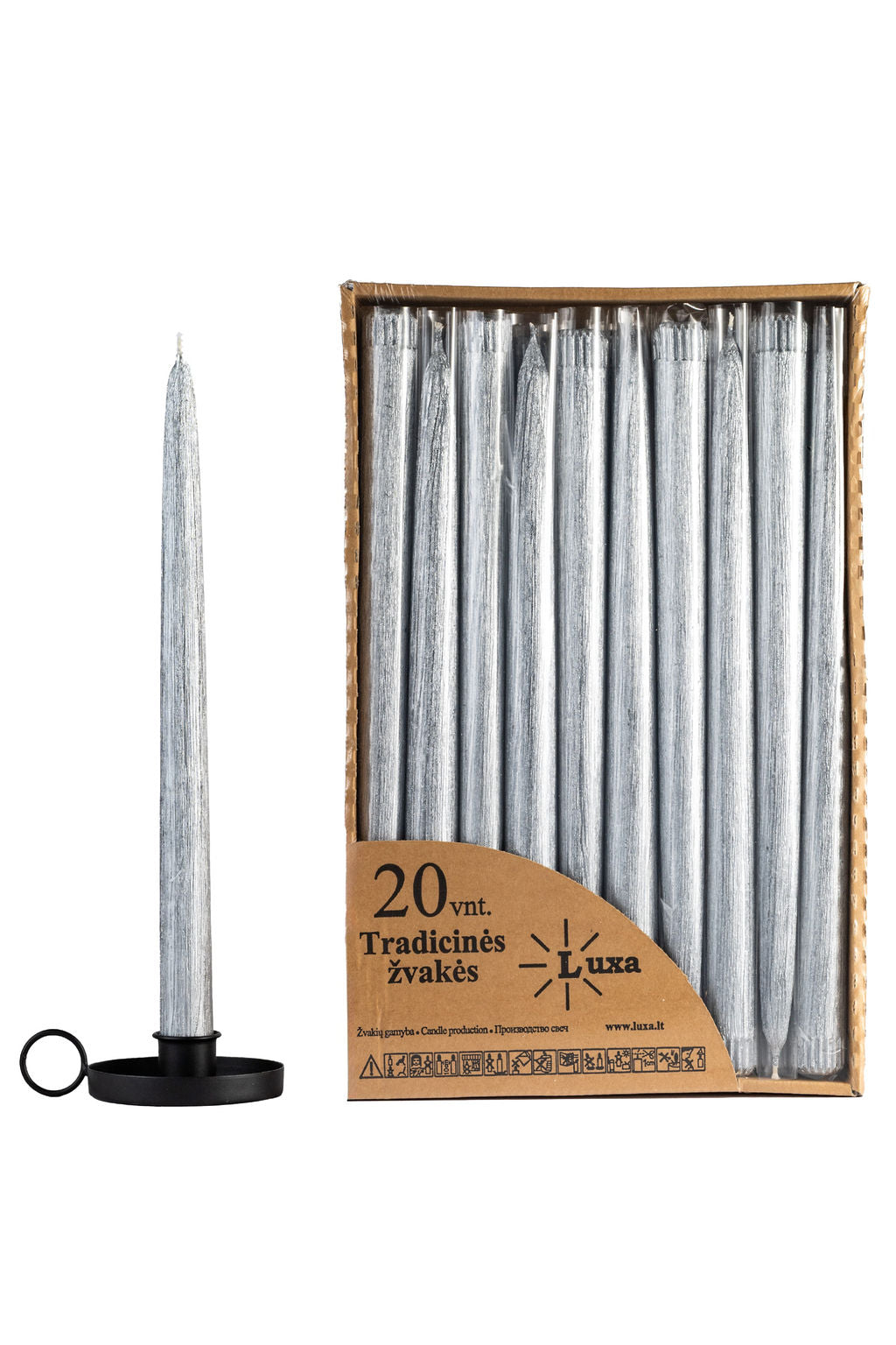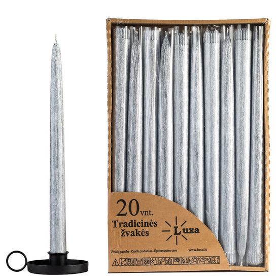 Tradicinės blizgios sidabro spalvos stalo žvakės (20 vnt. / 30 cm)