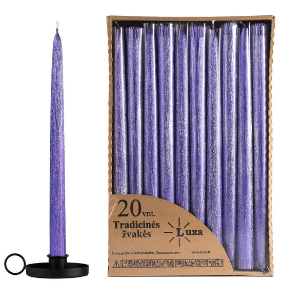 Tradicinės blizgios violetinės spalvos stalo žvakės (20 vnt. / 30 cm)
