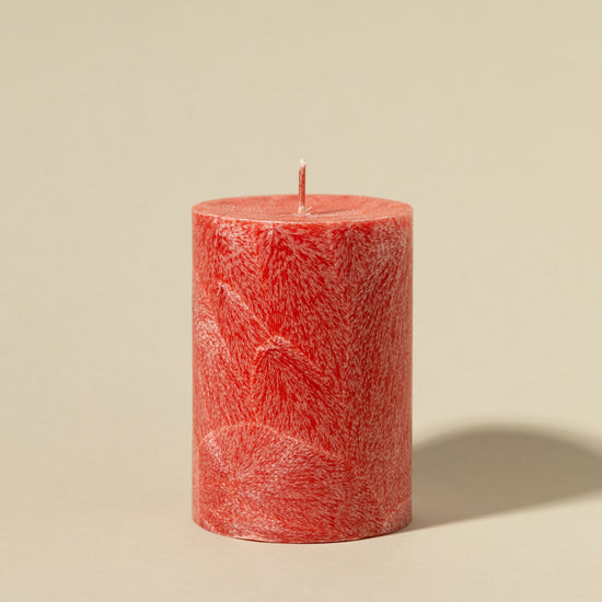 Prabangių spalvų, raižyta paviršiaus struktūra (rankų darbas) cilindrinės žvakės, pagamintos iš aukščiausios kokybės maistinio parafino. Žvakė papuoš namų interjerą ar terasą, nustebins draugą ar artimą.